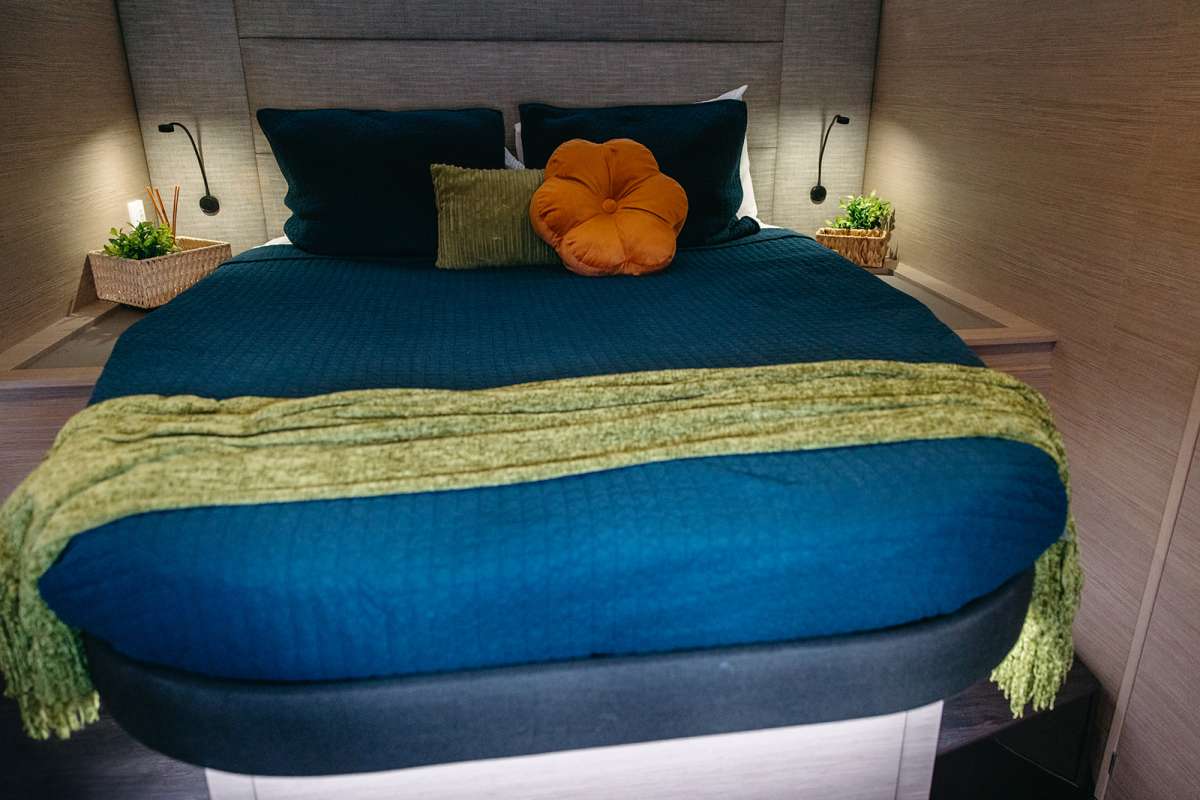 | (4) queen cabins, each with private ensuite bath with electric toilet, wash basin and separate shower stall. Spacious master stateroom has desk space, separate toilet room, and walk-in shower. All cabins have air conditioning, two fans, 110v outlets and dimmable recessed lighting. Upper deck lounge has sectional couch and sunbed area with 360 degree view. Forward deck has spacious lounge area with adjustable reclining seating, trampolines and sunning areas. Aft deck offers lounge area plus alfresco dining area. Salon offers lounge area with coffee table plus flat screen TV with many movies and USB capabilities. Upgraded 4 zone sound system provides music throughout all indoor and outdoor areas. | |