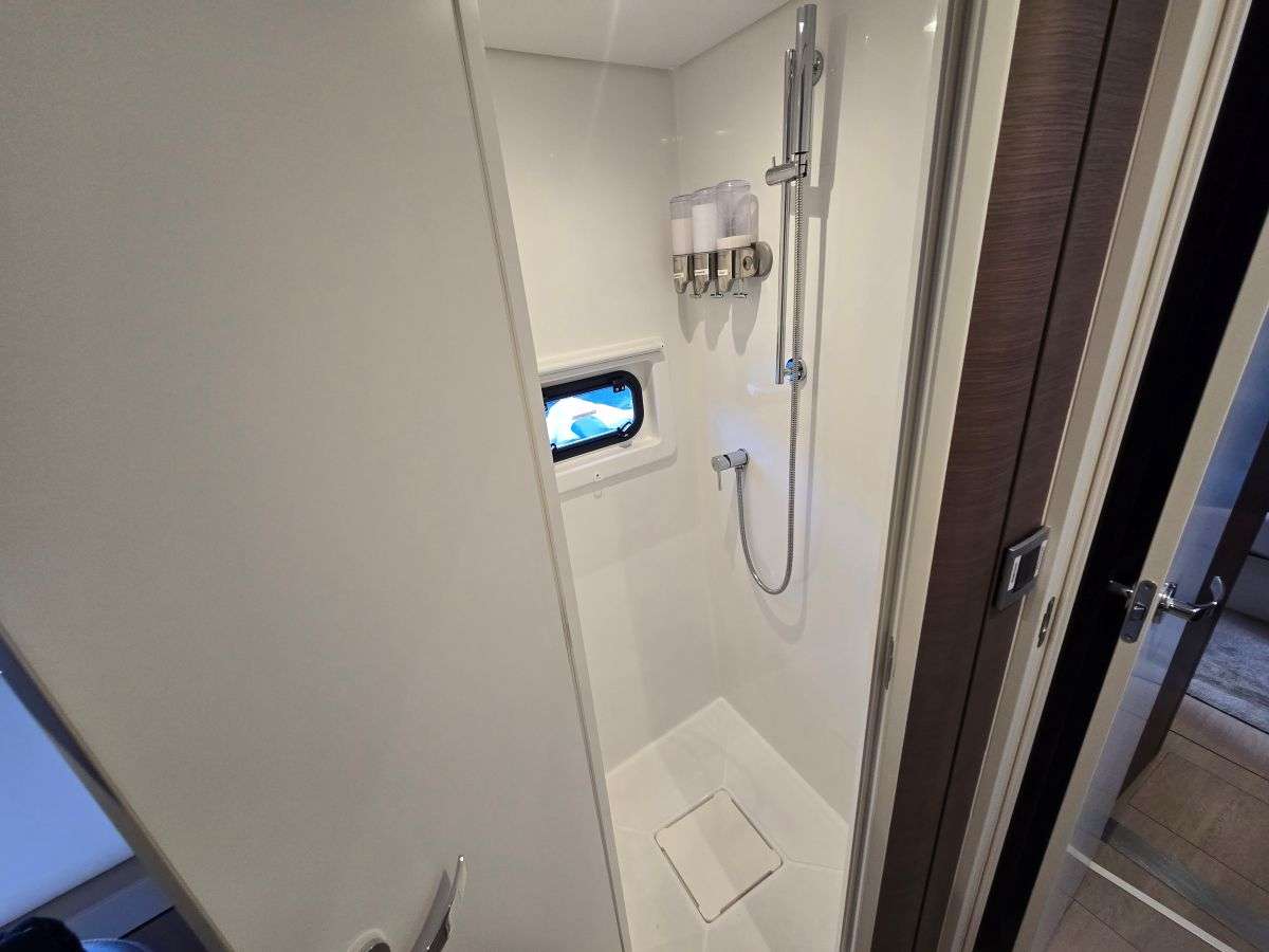 | 4 queen berth guest cabins each with a private en-suite electric head, shower and sink/vanity. Starboard side heads have dry stall showers, port side heads have wet showers. All cabins have individually contract air-conditioning for each cabins comfort. Top desk fly-bridge with lounging and seating with a 360 degree view. Forward cockpit and lounge and dining area. Aft cockpit with seating and dining accommodations. Main deck has a bright and airy main salon (fully air-conditioned) as the galley direct access to the forward cockpit lounge area. NO SMOKING ON YACHT BERTH SIZES: All queen berths are 5'w X 6'6"L Bunks: Top bunk 32"W x 75"L; bottom bunk 36"W x 75"L | |